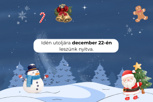 Idén utoljára december 22-én leszünk nyitva. Legközelebb január 5-én értek el minket személyesen, e-mailen és telefonon.Kellemes Ünnepeket kíván…